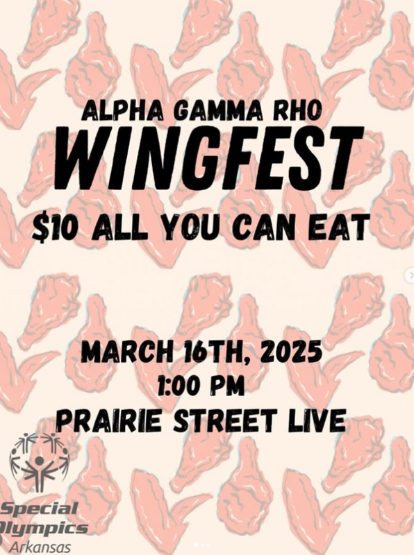 Annual AGR Wing Cook-Off Fundraiser. This is AGRs biggest philanthropy event, and it continues to grows every year with additions such as live music and "celebrity" judges from the UA, local first responders, and UA Greek Life staff. AGRs hold this event at Agri Park.